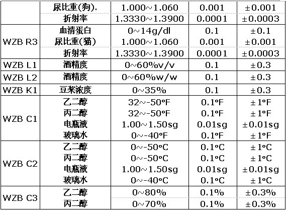 具有自動(dòng)溫度補(bǔ)償?shù)墓δ埽褂么螖?shù): 10000次以上,有自動(dòng)關(guān)機(jī)的省電功能,溫度顯示:攝氏/華氏轉(zhuǎn)換,有電量報(bào)警功能。系列中不同型號(hào)可分別顯示被測(cè)樣品的折射率、白利度、糖度、鹽度、波美度、可轉(zhuǎn)化酒精度、酒精度、豆槳濃度、尿比重、血清蛋白、乙二醇、丙二醇、電瓶液等